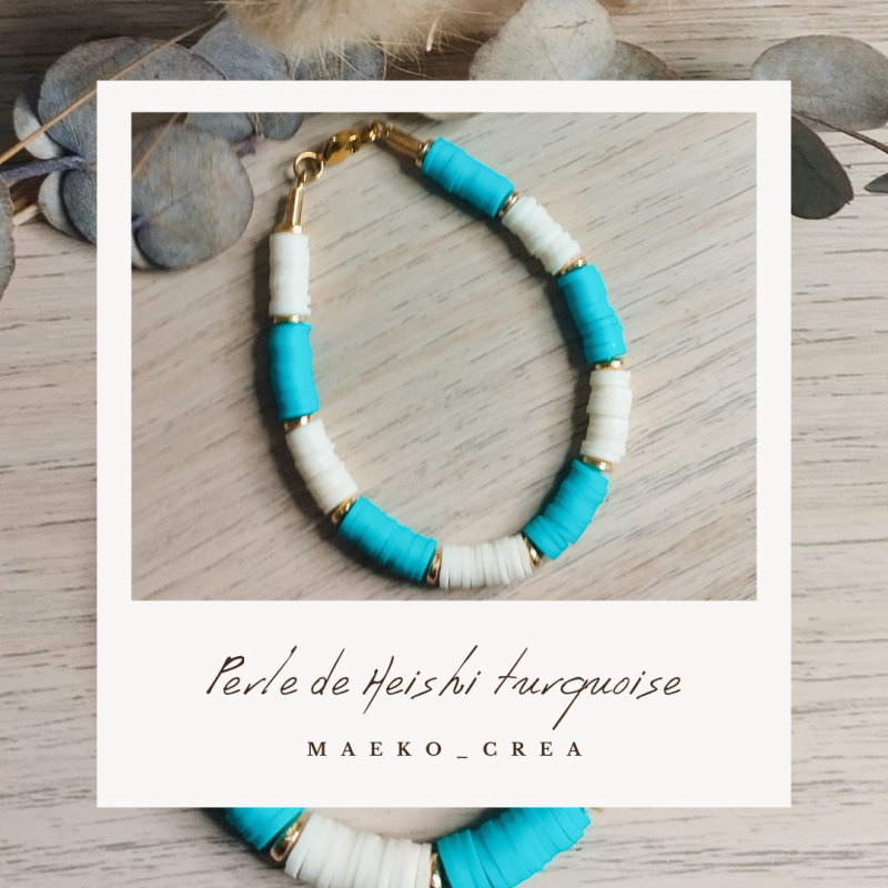 Les perles heishi, en turquoise et crème, évoquent la douceur et l’évasion.
